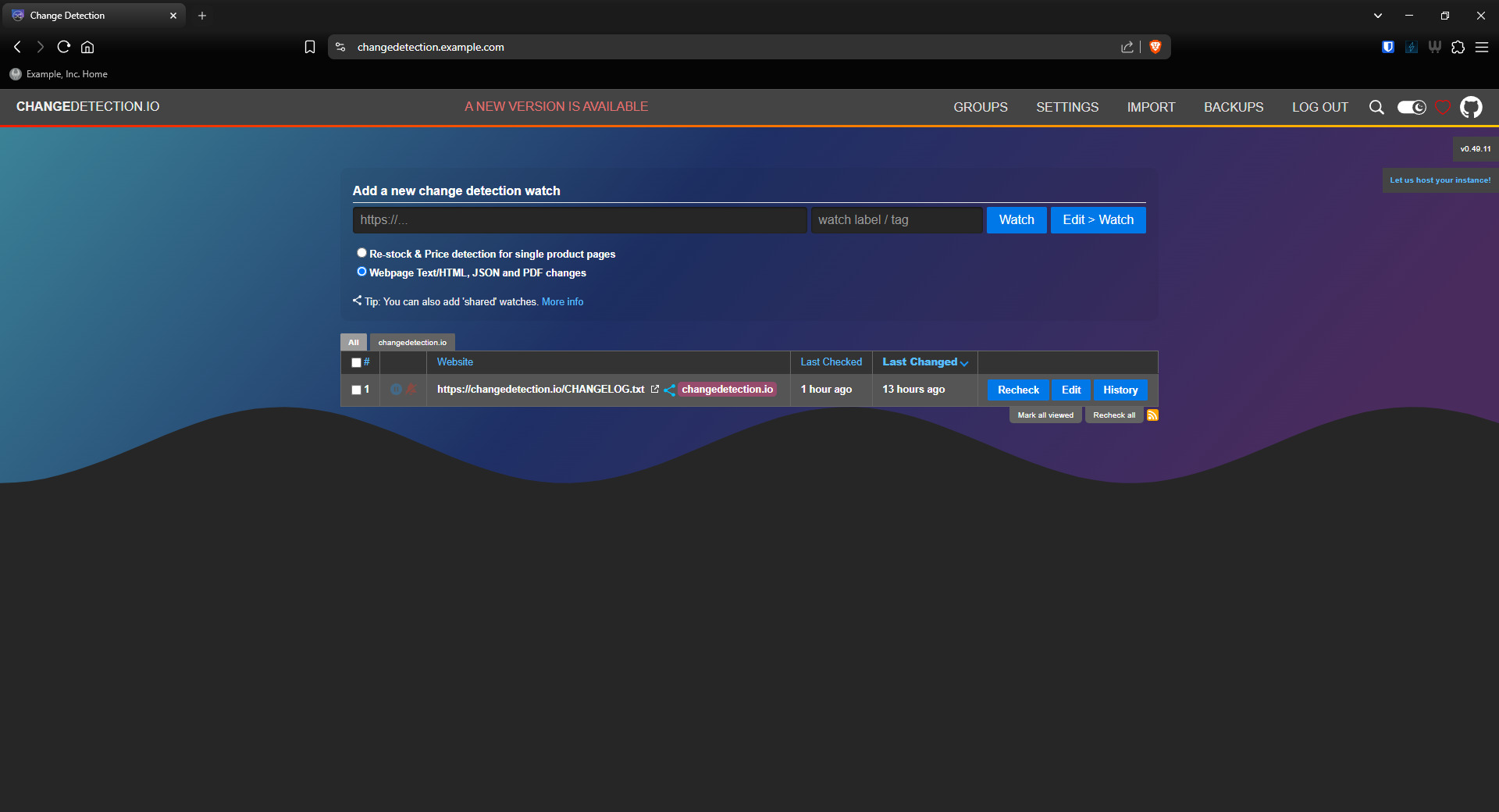 "The best and simplest free open source website change detection, website watcher, restock monitor and notification service. Restock Monitor, change detection. Designed for simplicity - Simply monitor which websites had a text change for free. Free Open source web page change detection, Website defacement monitoring, Price change notification."