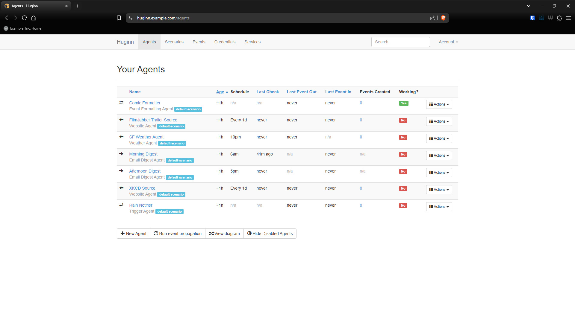 "Huginn is a system for building agents that perform automated tasks for you online. They can read the web, watch for events, and take actions on your behalf. Huginn's Agents create and consume events, propagating them along a directed graph. Think of it as a hackable version of IFTTT or Zapier on your own server. You always know who has your data. You do."