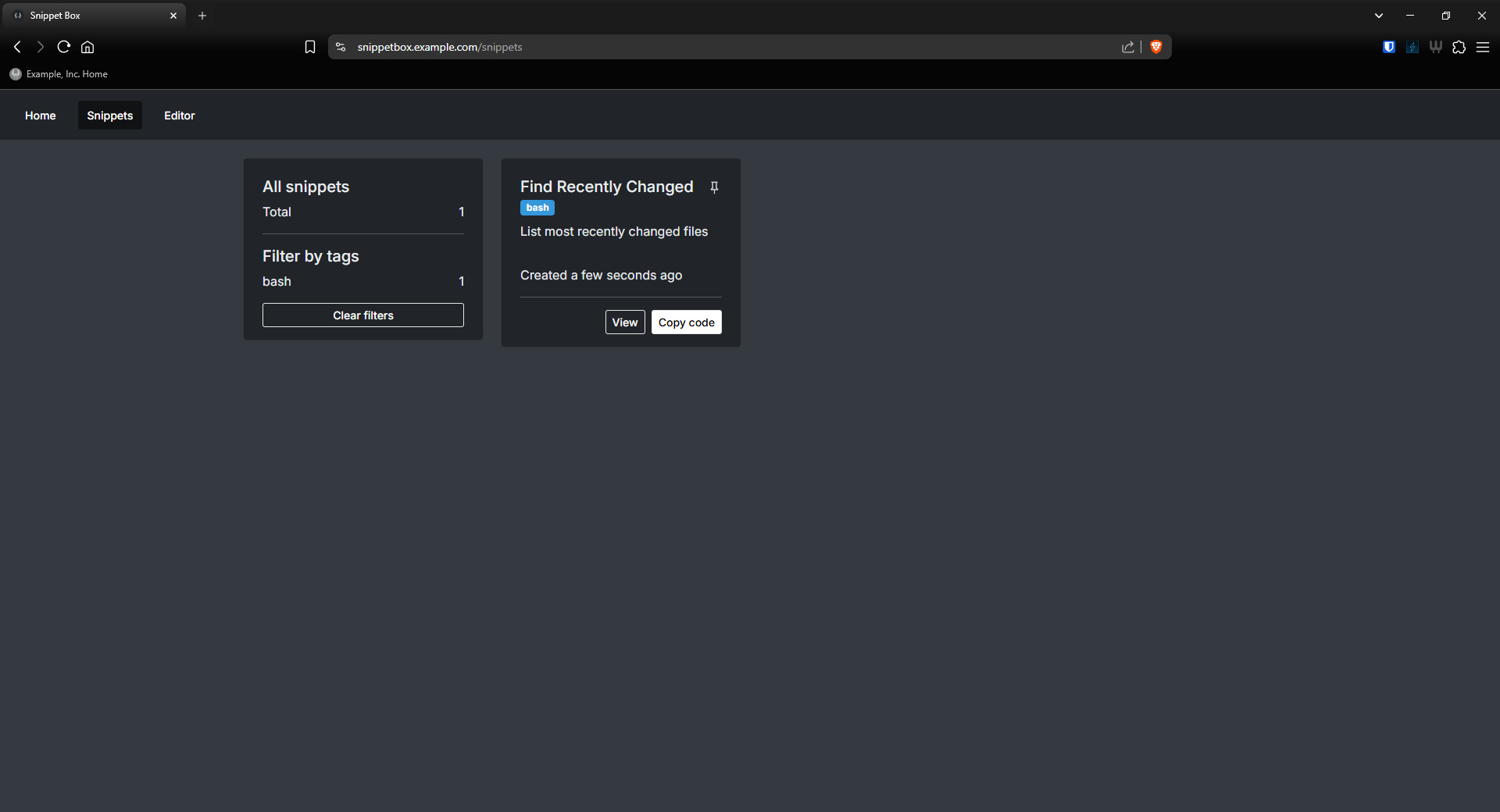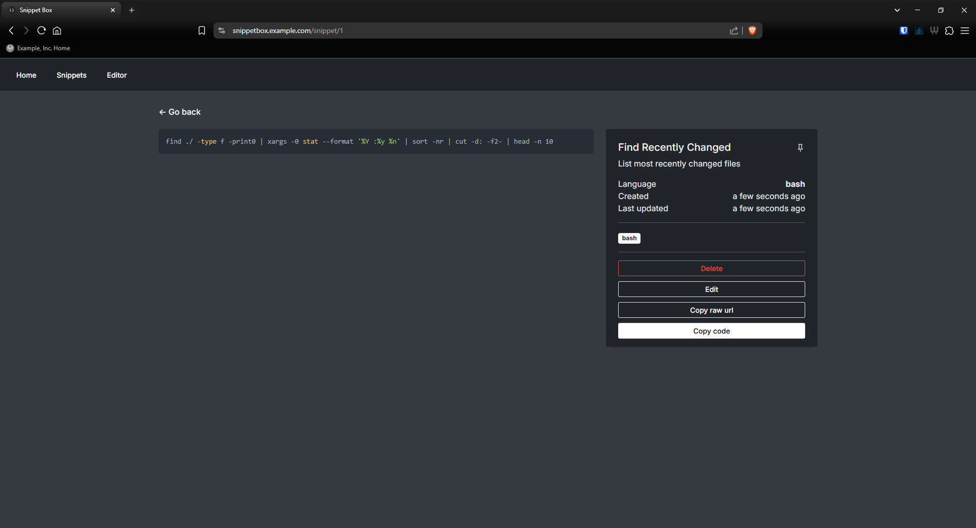 "Snippet Box is a simple self-hosted app for organizing your code snippets. It allows you to easily create, edit, browse and manage your snippets in various languages. With built-in Markdown support, Snippet Box makes it very easy to add notes or simple documentation to your code."