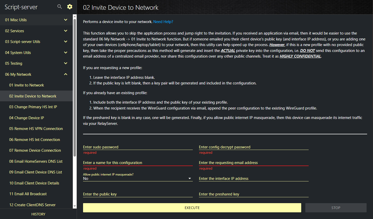 Go to 06 My Network -> 02 Invite Device to Network in Script-server. Read the provided instructions and fill out the required fields. If you do not specify any keys, then they will be automatically generated and inserted into the resulting configuration file.