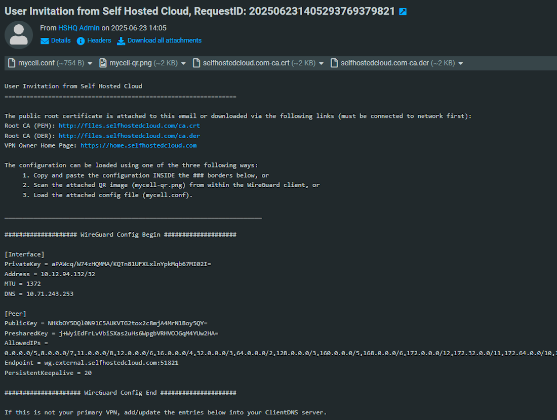 Go to the inbox of the email address specified in Step 1 and open up the User Invitation email. Use the provided QR code image or configuration file attachment to import the configuration into WireGuard.